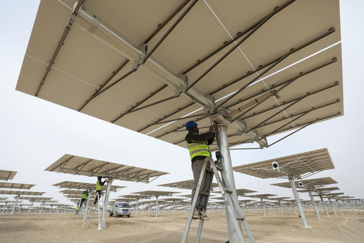 △ 2024年3月12日,甘肅省酒泉市金塔中光太陽能10萬千瓦光熱+60萬千瓦光伏項(xiàng)目現(xiàn)場(chǎng),施工人員有序作業(yè)。