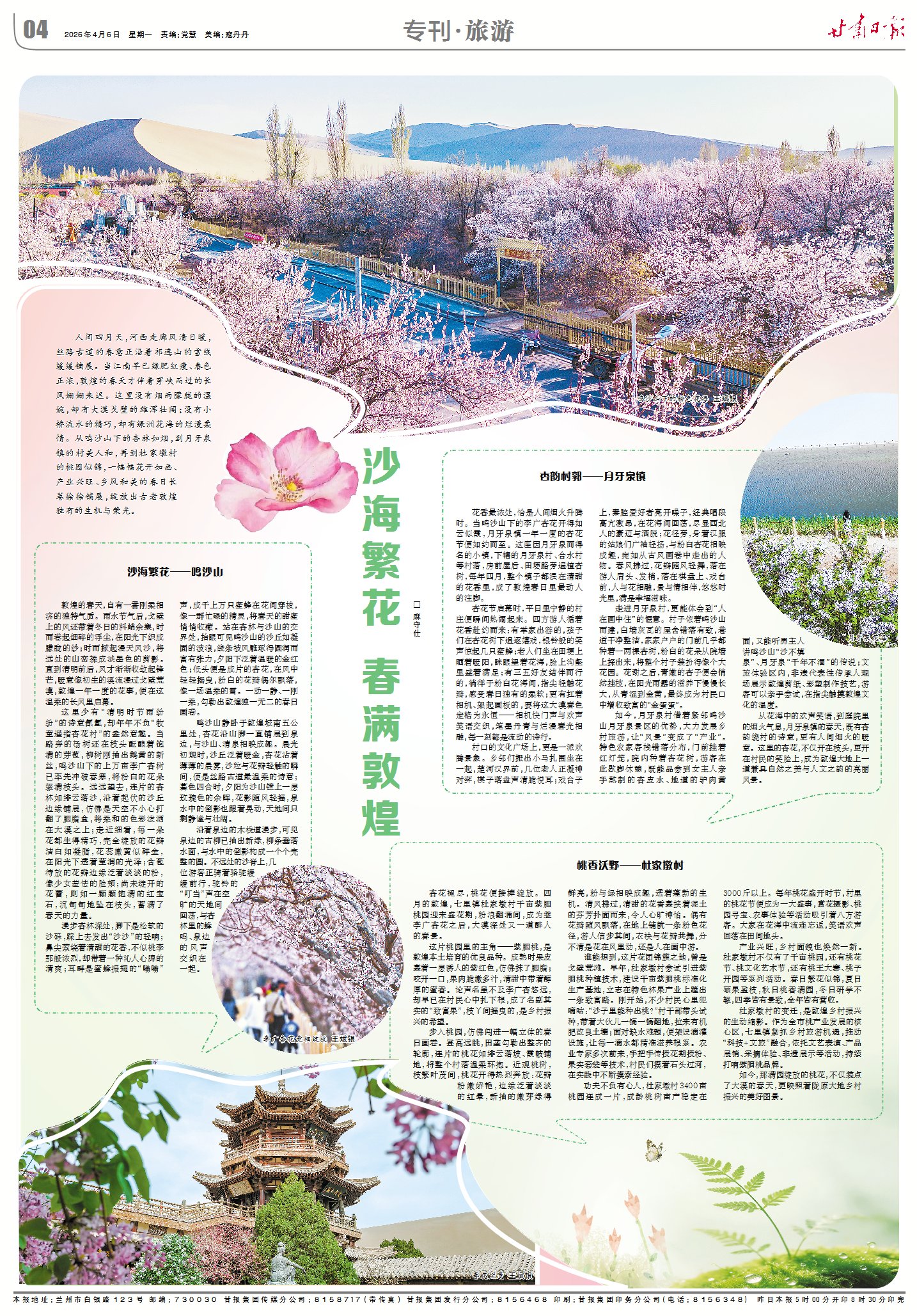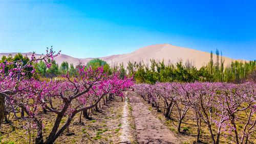 人間四月天,河西走廊風(fēng)清日暖,絲路古道的春意正沿著祁連山的雪線緩緩鋪展。當(dāng)江南早已綠肥紅瘦、春色正濃,敦煌的春天才伴著穿峽而過的長風(fēng)姍姍來遲。這里沒有煙雨朦朧的溫婉,卻有大漠戈壁的雄渾壯闊;沒有小橋流水的精巧,卻有綠洲花海的爛漫柔情。從鳴沙山下的杏林如煙,到月牙泉鎮(zhèn)的村美人和,再到杜家墩村的桃園似錦,一幅幅花開如畫、產(chǎn)業(yè)興旺、鄉(xiāng)風(fēng)和美的春日長卷徐徐鋪展,綻放出古老敦煌獨有的生機與榮光。